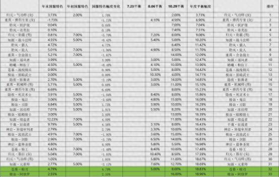本年度平衡幅度最高为审判36.06,最低的为花花3.73%,他们的平衡幅度差距高达31.37%